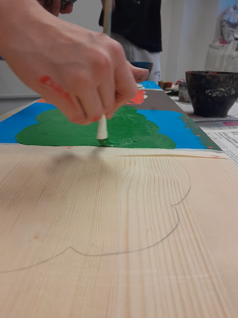 Jedes Team überlegte sich vorher, wie sie ihr Holzbrett bemalen wollen, fertigten Skizzen entweder direkt auf dem Holz oder auf ein Blatt Papier. Danach konnten sie mit dem Mischen der Farben beginnen…