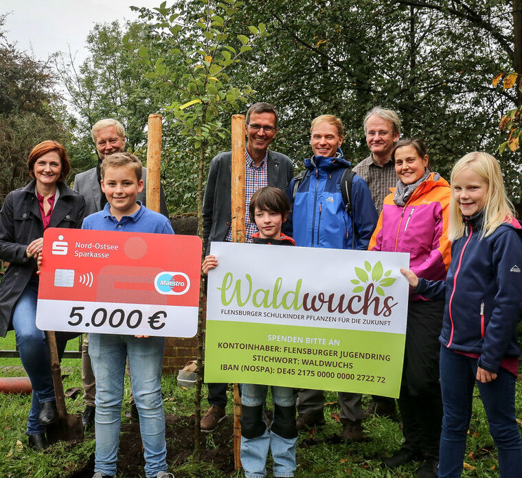 „Waldwuchs – Flensburger Schulkinder pflanzen für die Zukunft“ heißt das Projekt, welches auf das Engagement eines Schülers der Goetheschule zurück geht. Der symbolische Projektstart war am 03. Oktober 2019 im Rahmen der bundesweiten Aktion „Einheitsbuddeln“ mit dem pflanzen eines Apfelbäumchens an der Goetheschule in Flensburg, gefallen. Die Patenschaft für das eigentliche im November 2019 auf einer privaten Fläche in Goldebek (NF) durchgeführte Projekt hatte der Flensburger Jugendring übernommen, die Schirmherrschaft wiederum Oberbürgermeisterin Simone Lange und das Hauptsponsoring die Nord- Ostsee Sparkasse.